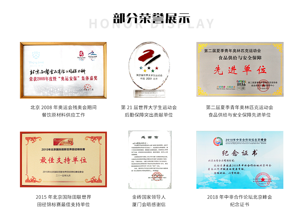公司先后通過了HACCP、ISO22000、FSSC22000食品安全管理體系認(rèn)證。是北京奧運(yùn)會(huì)和北京冬奧會(huì)、冬殘奧會(huì)運(yùn)動(dòng)員餐指定的西式肉制品供應(yīng)保障企業(yè),也是第21屆世界大學(xué)生運(yùn)動(dòng)會(huì)、廈門金磚會(huì)議、上合組織峰會(huì)、中非合作論壇、“一帶一路”、建國70周年、抗戰(zhàn)勝利80周年、全國兩會(huì)等多項(xiàng)重大活動(dòng)的肉制品供應(yīng)單位。