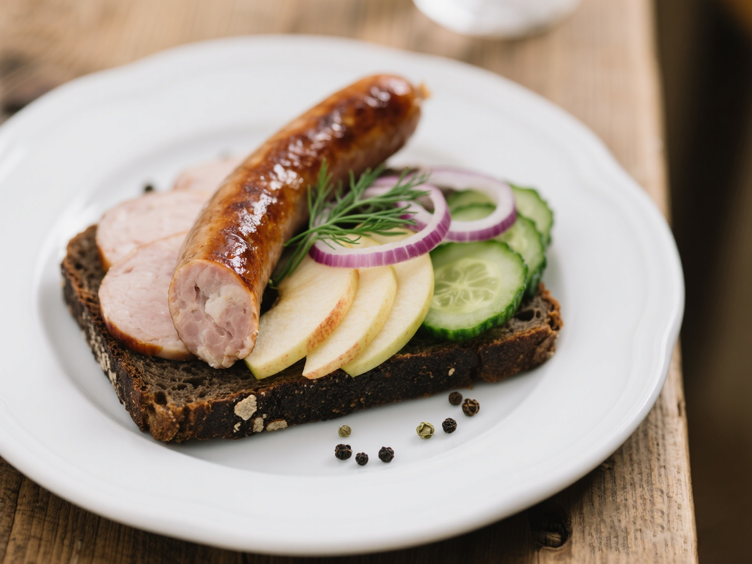 ③ 堆疊食材: 在面包片上依次鋪上:蘋(píng)果片/梨片 -> 煎好的林堡腸片 -> 酸黃瓜片 -> 紅洋蔥圈。