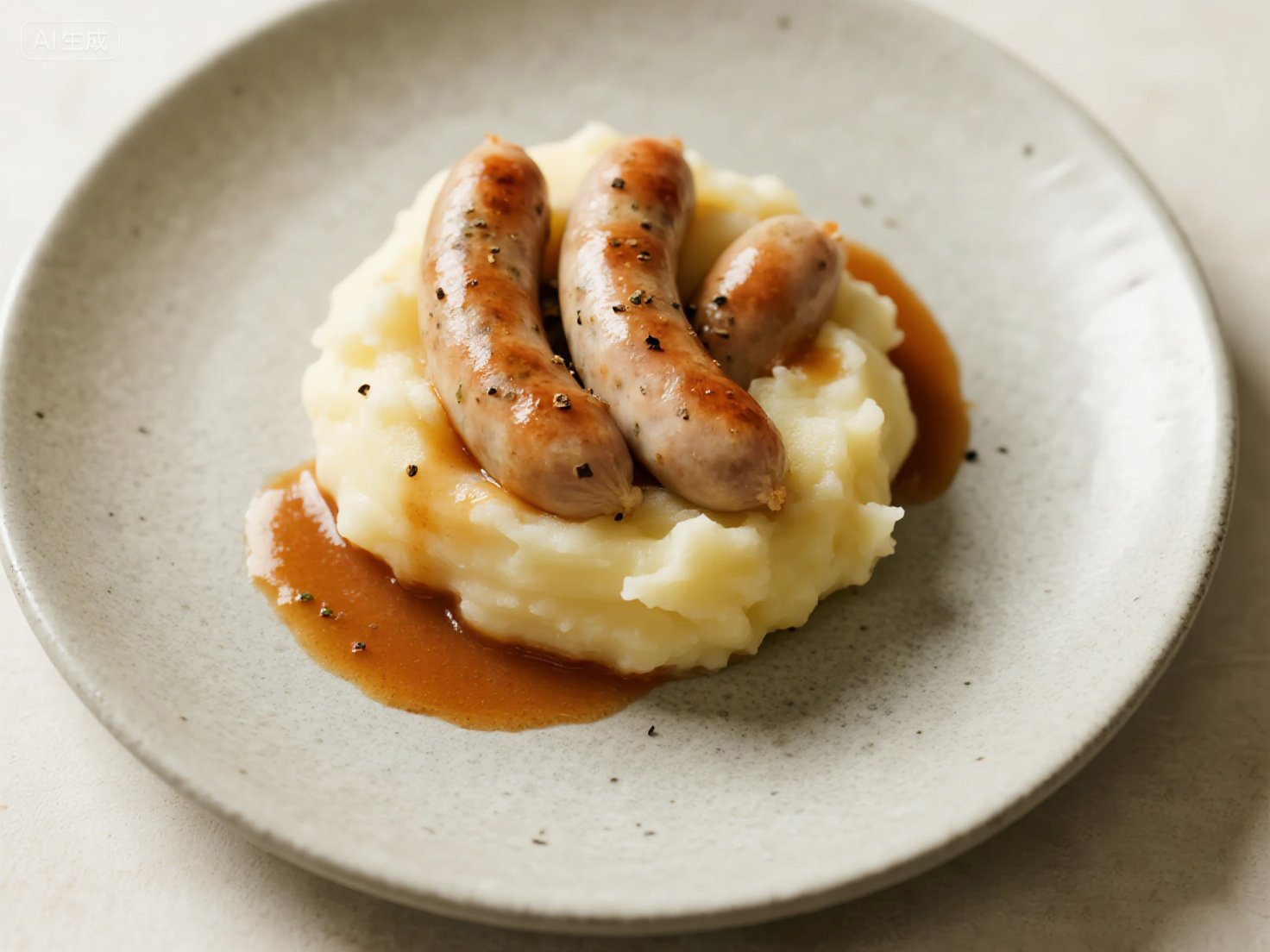 ③組裝:盤中鋪土豆泥 → 插入煎好的香腸 → 淋煎腸油汁