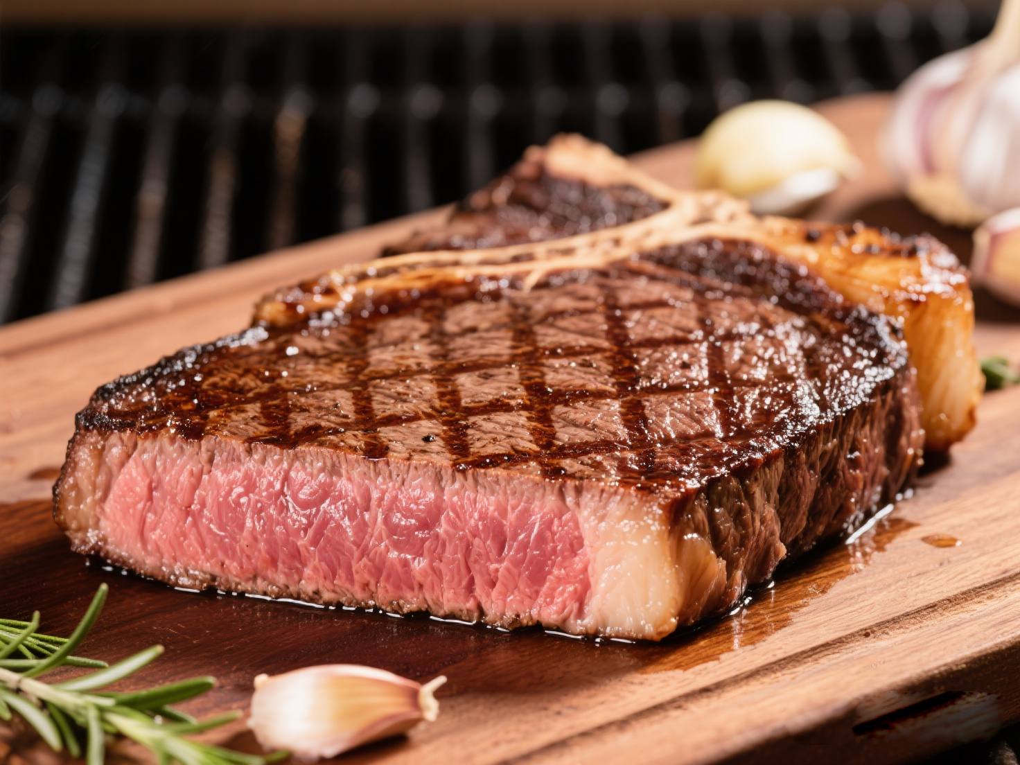 ③ 增香與控溫:轉(zhuǎn)中小火,加入黃油、拍扁的大蒜和香草。黃油融化后,用勺子將香草黃油不斷淋在牛排表面,持續(xù)1-2分鐘(此過程可為牛排降溫,避免內(nèi)部過熟)。
