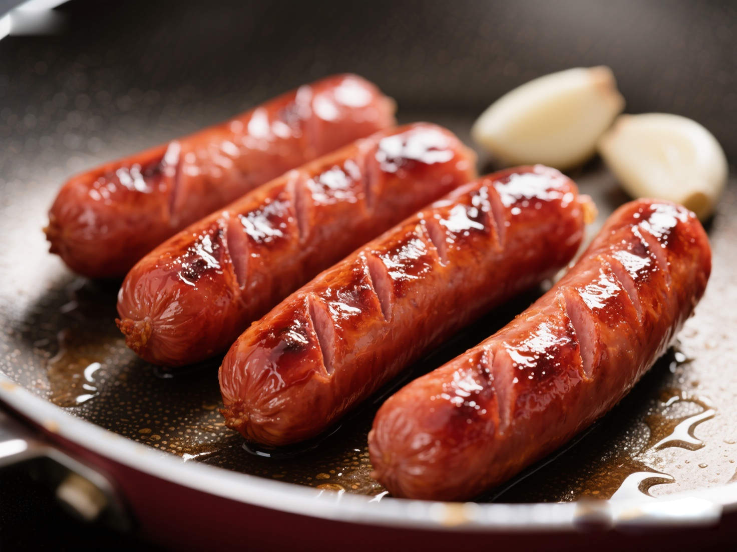 ② 煎制:平底鍋微熱后,放入烤腸,加入少量清水(約50ml),蓋上鍋蓋,中火燜煎2分鐘至水干。