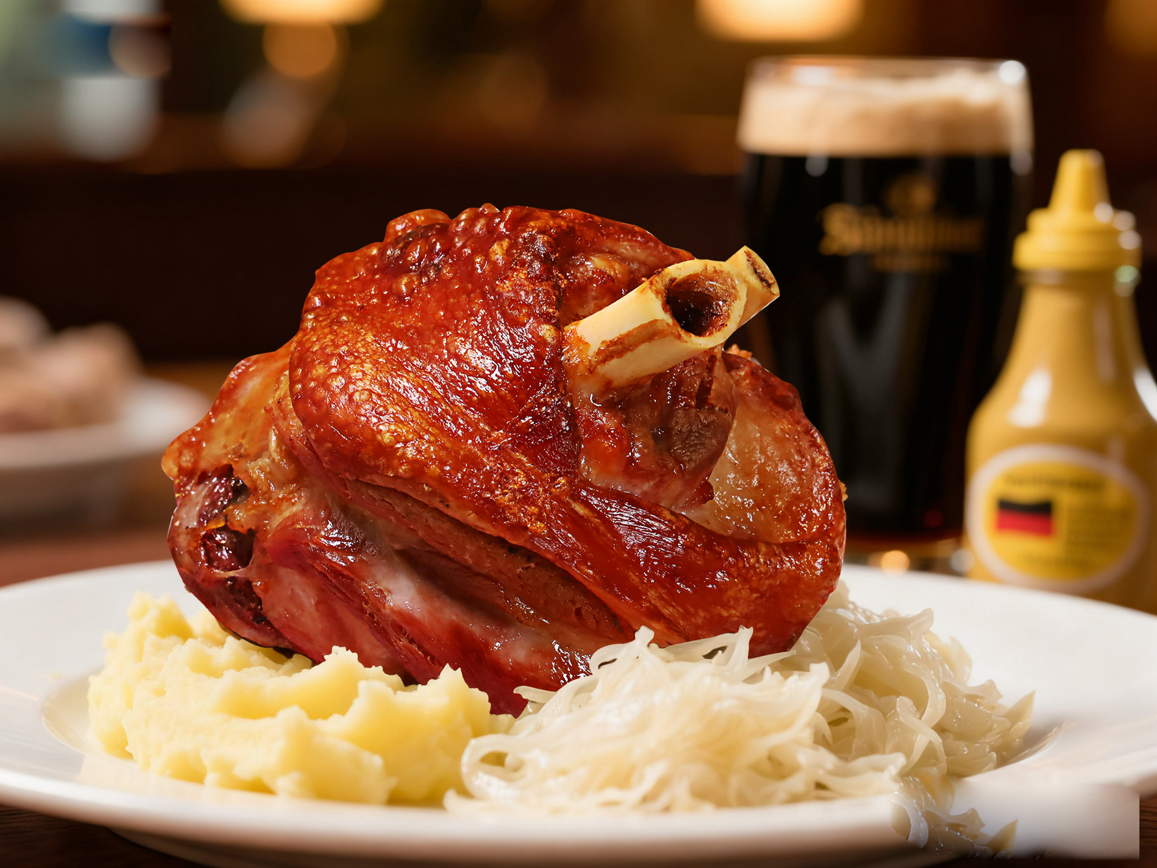 還原德國(guó)啤酒屋的黃金脆皮,搭配經(jīng)典德式酸菜與土豆泥。